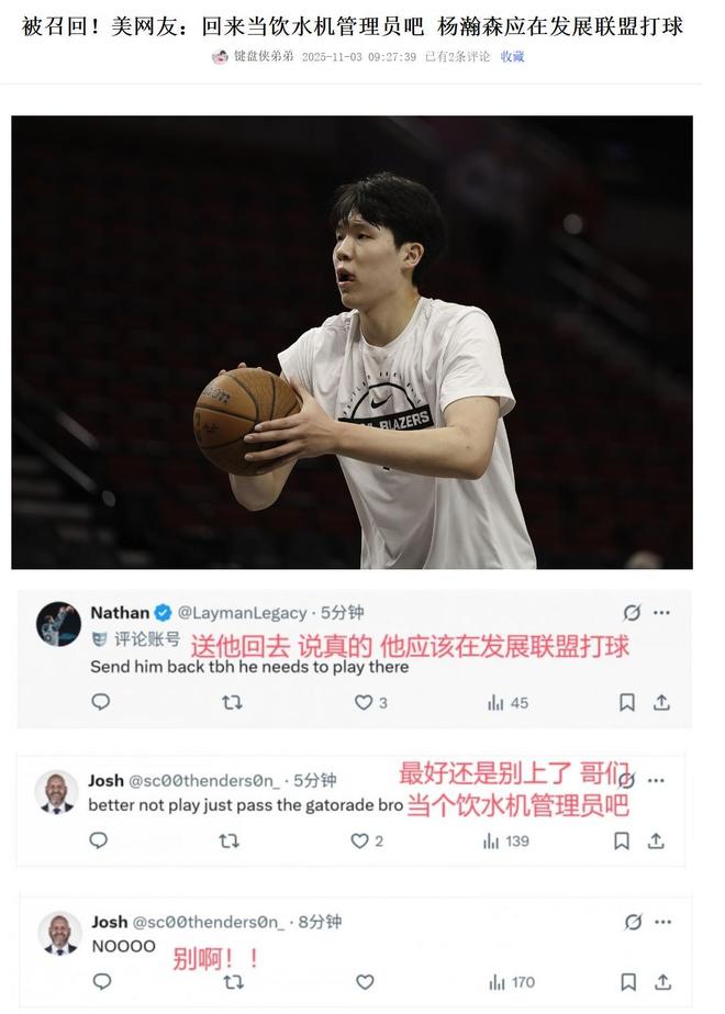 也许是因为前面几场比赛的成绩太过平庸,杨瀚森回归的消息反倒让有一些国外的球迷有些担忧,担心他会拖了球队的后腿。所以我们也看到网上有些外国的球迷纷纷在社交平台留言喊话杨瀚森就先别回来了,在发展联盟好好打球吧。还有一些球迷认为,杨瀚森现在这样的水平回归球队,估计只适合当球队饮水机的管理员。